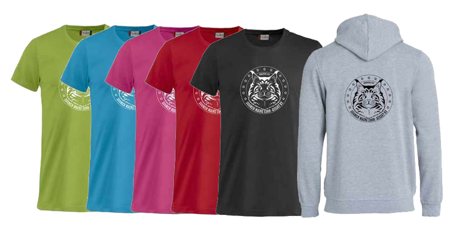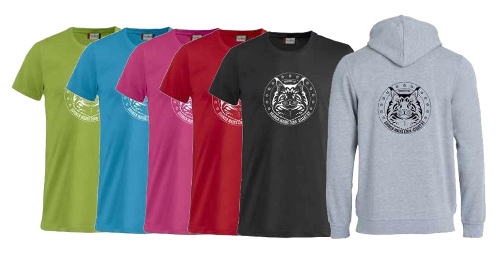 Paitoja ja huppareita on saatavissa eri väreissä ja koossa, kokotaulukot löytyvät tämän sivun alalaidasta. Painatus voi olla selässä tai edessä joko mustalla tai valkoisella painatuksella. Tilauksia pyritään kokoamaan useampi ja toimitetaan näyttelyihin tai tarvittaessa postitse, jolloin tilaaja maksaa postikulut. Tilaukset: tuotemyynti(at)mainecoon.fi tai alla olevalla lomakkeella.